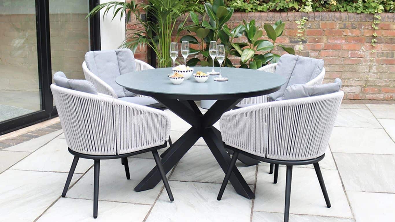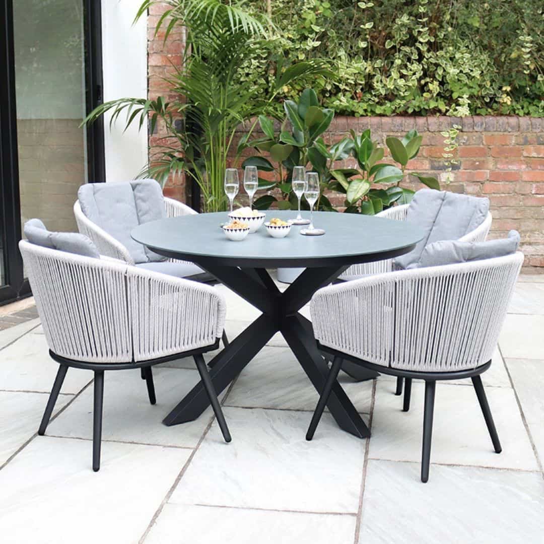 Light Brown Rope and Acacia Wood Lounge Set with 2 Waxed Polish Concrete Round Coffee TablesLight Brown Rope and Acacia Wood Lounge Set with 2 Waxed Polish Concrete Round Coffee Tables